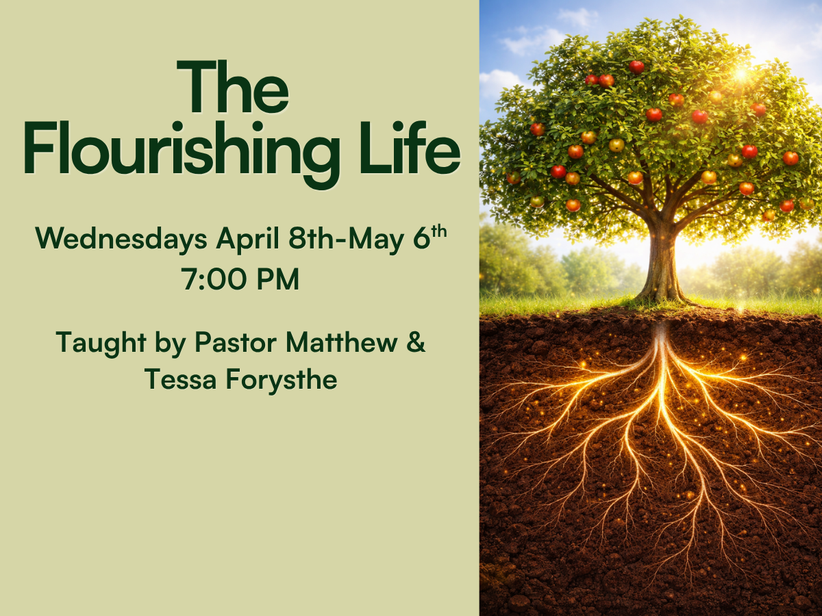 Join Pastor Matthew & Tessa Forsythe, beginning April 8th, for this five-week discipleship class, The Flourishing Life, where we will explore how a healthy spiritual life grows. First, we will focus on identity—who you are in Christ—becoming deeply rooted in the truth of the gospel. Then we will discover what a flourishing life looks like, learning the rhythms and lifestyle that help believers grow strong and bear fruit in their walk with Jesus.