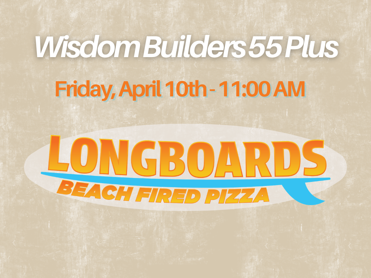 We are so excited to gather together for fellowship on Friday, April 10th, at 11:00 AM at Longboards Beach Fired Pizza and Big Wave Yogurt! This event is for ages 55 and up. Please sign up at the link so we know how many to expect.