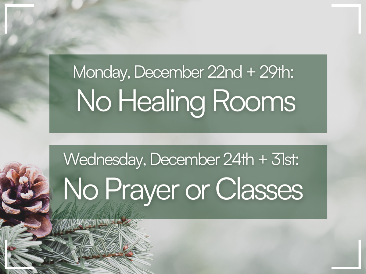 There will not be Healing Rooms on Monday, December 22nd or 29th. Nor will there be Wednesday Morning Prayer, or Wednesday Night Classes (Adult, Kids, or Youth) on Wednesday, December 24th or 31st. Join us for our Candlelight Christmas Eve service on December 24th.